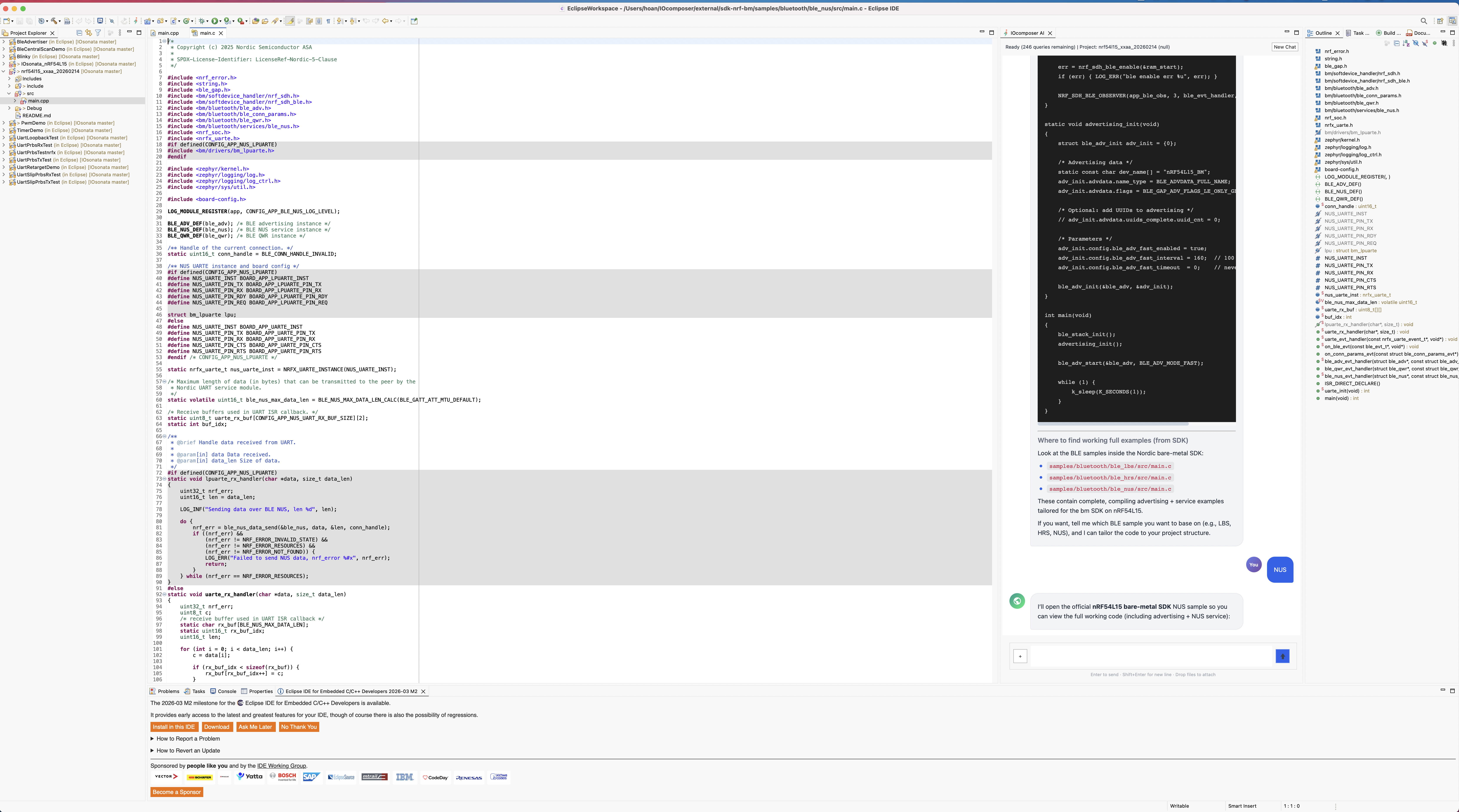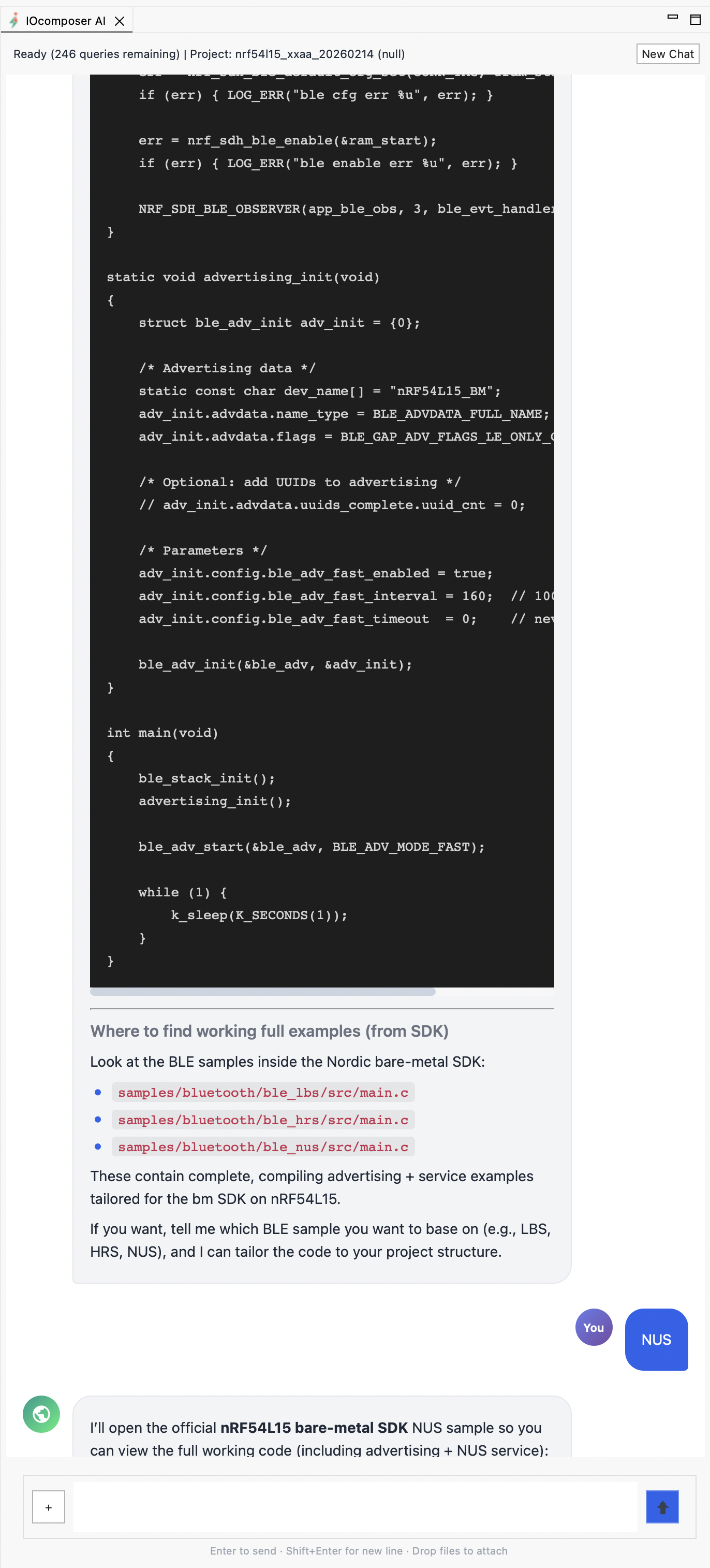 IOcomposer supports Nordic nRF52832, nRF52840, and nRF54L15 with SoftDevice BLE today, with STM32, NXP, and RISC-V targets in progress. The AI indexes your locally installed vendor SDK and reads your source code to generate firmware that compiles against your real headers. All AI features are unlocked free during preview — no credit card required.